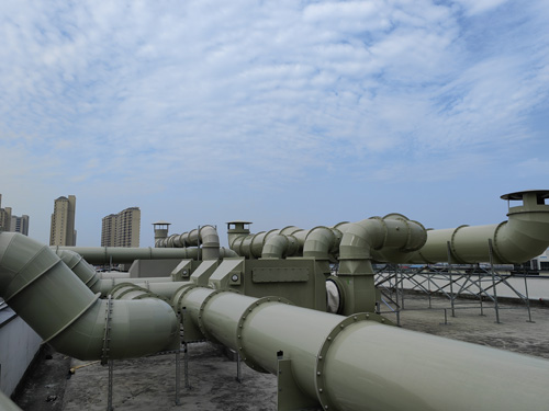 檢測室廢氣廢氣 → 可溶性炭篩選器 → 引軸流式風機 → 廢氣